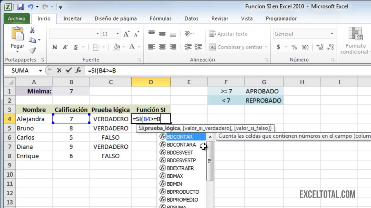 Además de especificar la prueba lógica para la función SI también podemos especificar valores a devolver de acuerdo al resultado de la función.