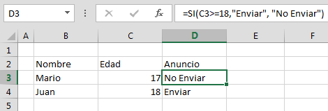 Por tanto, si la celda C3 es mayor o igual a 18 se mostrará «Enviar», en caso contrario se mostrará «No Enviar». Notemos que si copiamos esta fórmula a la fila 4, en dicha fila se obtendrá como resultado «Enviar» debido a que en dicha fila la celda C4 tiene el valor 18.
