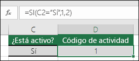 Por ejemplo, =SI(C2="Sí",1,2) dice: SI(C2 = Sí, entonces devolver un 1, en caso contrario devolver un 2)