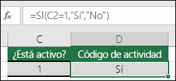 En este ejemplo, la fórmula de la celda D2 dice: SI(C2 = 1, entonces devolver Sí, en caso contrario devolver No)Como puede ver, la función SI se puede usar para evaluar texto o valores. También se puede usar para evaluar errores. No está limitado exclusivamente a comprobar si un elemento es igual a otro y devolver un único resultado, también puede usar operadores matemáticos y realizar cálculos adicionales según sus criterios. También se pueden anidar varias funciones SI para realizar varias comparaciones.