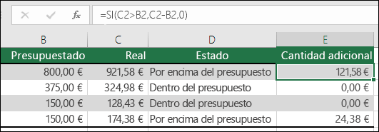 =SI(C2>B2,"Presupuesto excedido","Dentro de presupuesto")