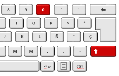 Para hacer una fórmula en Excel debemos seleccionar una celda donde queremos incluir la fórmula y empezaremos escribiendo el símbolo igual (=) que en el teclado se encuentra normalmente donde el 0. Para incluir el símbolo igual deberemos hacer click en la tecla Mayúscula y después en el 0 como se puede ver en la siguiente imagen: